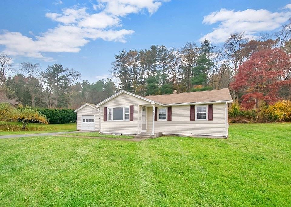Great commuter LOCATION on Rt 67 with easy access to MA Pike & Rt 20! Nestled on almost an acre lot, this Ranch features lots of playing field & spectacular mountain views! Still time to enjoy the covered breezeway & expand your outdoor entertainment on the patio with convenient side access to the 1 car garage. Waiting for your ideas, the freshly painted Eat-In Kitchen gets you started with newer 2022 vinyl flooring & propane stove for your cooking delight. Featuring plenty of space in the bright LivingRm offering hardwood floors & flooding with natural light! You'll be impressed with a good size Main Bedroom & plenty of storage with all 3 Bedrooms offering double closets & hardwood floors. Dreaming of more space? Bring your ideas to the basement....options just waiting for you to revamp the bar for an added entertainment space, game or Family Rm & laundry room. WOW, new electric service to be installed! Get ready to unpack your bags with plenty of time to bring this one HOME for 2022!