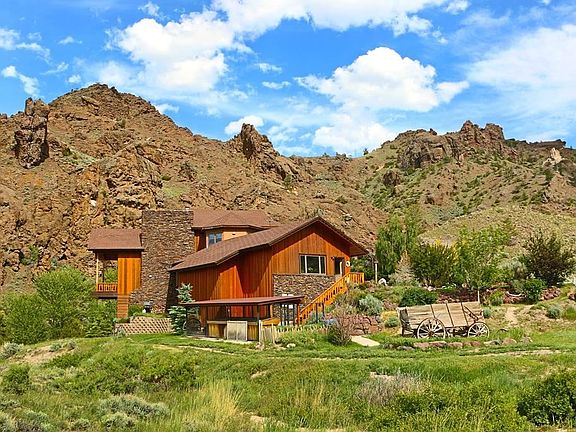 Unbelievable offering, 179+ acres with 3 houses and apartment. 40 ac. irrigated, Breteche Creek flows thru, borders thousands of acres of BLM land. Heavy wildlife area: Elk, Deer and Sheep on property. End of Road privacy, with incredible views of mountains, basalt rock formations, treed creek bottom, corrals, irrigated pasture. Own your own private valley. 1/4 mi. paved driveway to main house.