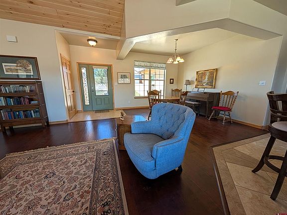 86 Brookside Trail is a spacious, airy, and air conditioned 3 BR/2 bathroom home located just mins from Bayfield and Durango. This meticulously cared for home functions overall as a one level house, with a finished bonus room above the 2 car garage that could serve as an additional media room, office, play/craft room or simple flex space. All your daily living needs are conveniently located on the first floor: featuring an open floor plan with vaulted tongue and groove wood ceilings, engineered wood floors, large back deck, and bar top area overlooking the kitchen. The kitchen has a great deal of both counter top space and storage, as well as a nook overlooking the backyard where you might see deer and turkey in the open space behind the home. The dining area is adjacent to and visible from these two spaces, and all of these rooms take advantage of huge windows that offer an abundance of natural light as well as beautiful views of the green fields behind the home. The primary bedroom is located on one end of the main level. It includes an ensuite walk in closet as well as a five piece bathroom that includes a large soaking tub, separate walk in shower, closeted lavatory, and a double sink set up with plenty of counter space, cabinets and storage. On the other side of the home are the two other bedrooms, each of good size with double closets, large windows, and plenty of room to spread out. These bedrooms share access to a nicely finished full bathroom situated between them. A laundry room completes the main level. For extra living space, a large, finished room above the garage is available. The two car garage below offers plenty of storage and parking for 2 large vehicles. For enjoying the outdoors, a gorgeous custom deck is found just off the Great Room and kitchen by way of glass doors. It is partially covered and overlooks the backyard and 6 acres of HOA open space. The property itself has been extensively landscaped and includes a Rain Bird sprinkler and irrigation system. There are a range of trees, attractive hardscape, and just enough lawn to enjoy but not take up your whole weekend to maintain. Easy to miss but important to note are a few expensive upgrades outside that include roof gutters, heat treatments and french drains to maximize efficiency with snow melt and water drainage. And a big plus that can not be under valued is the natural gas, central water and sewer utilities featured in this neighborhood. Additional RV Parking is available in the neighborhood so you don't have to crowd your living spaces with all your big toys. Come on over and check out this well-maintained and affordable family home!