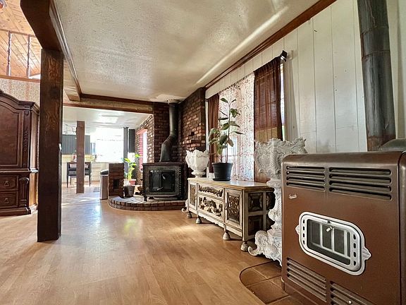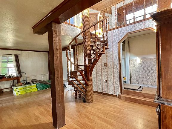 ALL KINDS OF CHARACTER! This unique home has 1800 s.f. of living space that includes 3 beds, 2 baths, parlor/den, over-sized kitchen, & living room w/ centerpiece spiral staircase. The kitchen has a corner sink w/ large windows to enjoy the view of the outdoors while working & a cute little breakfast nook, along w/ a wood stove on a large custom brick hearth that extends into the living room, where another classic wood stove is located. Two bedrooms located on the main level while third bedroom is located up the spiral staircase, encompassing the second level, where many windows let in a ton of natural light. Deck off of second story just needs a little work to be a great place for enjoying the view or maybe even a little mini garden. One bathroom has had some updating & features a claw foot tub, pedestal sink, high-tank pull-chain toilet, and stained glass window for a fun old fashioned feel. 110 s.f. enclosed wrap around porch adds to the living space. Huge barn has room for animals, cars, or storage, & is plumbed for water & power where second level was intended to be living space. Detached 2 car garage has been enclosed & finished for workshop, storage, or more. All city utilities & 2 flat acres!