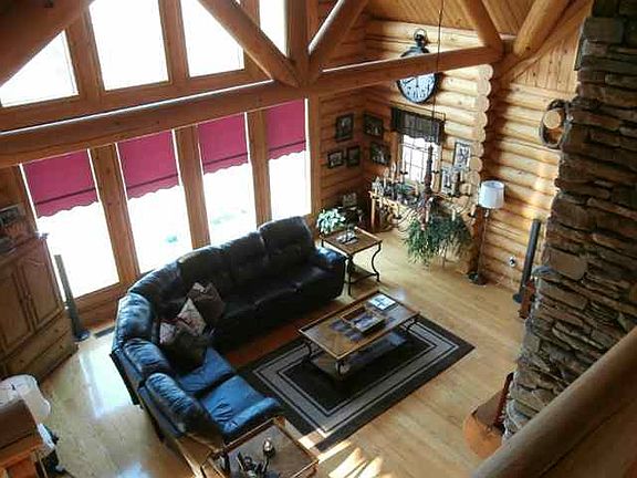 Come take a look at this beautiful custom log home that has views you must see to believe. The property includes the main home, a 40x40 heated 3 car garage, and a 20x27 barn with a 10x27 over hang. Detailed landscaping surrounds the property and adds curb appeal as you approach. The 5 bedroom home includes a main floor master suite, 2 bedrooms on the upper level, and 2 more non-conforming bedrooms downstairs. As you step inside the main level of the home, the logs accents add a majestic feeling, and the living room with floor to ceiling stone fireplace and hardwood flooring enhances the charm. The kitchen includes most appliances and has a breakfast bar for light meals, plus the dining room gives access to the front deck where you can relax during a barbeque while you take in the endless views. Buyer responsible for verifying all information on this MLS document.