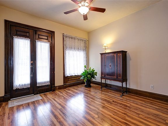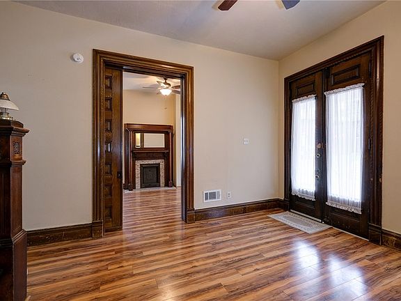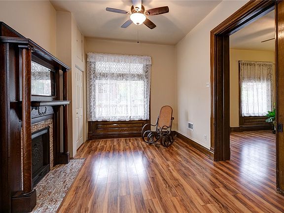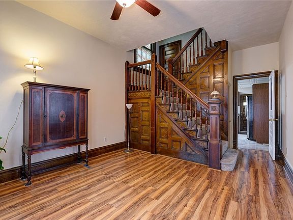 A true gem! The huge Foyer with wood staircase has "feathering" to enhance its beauty! From the Foyer open original pocket doors to the Living Room with decorative fireplace and wood mantel. Walk thru another pocket door to the Dining Room. These three rooms could be interchanged to fit your lifestyle.1st floor with Brand new wood flooring and the entire home has been freshly painted. The large kitchen has been renovated with dark wood cabinetry including 2 pantries, stainless appliances and an eating counter, additional workspace or a serving buffet and leads to a private patio and yard. The upper level has 4 very large bedrooms, one has been converted to a laundry. The home has full bathroom on main and full on upper floor. The 3rd level is unfinished but has 3 generous rooms and the lower level also unfinished has plenty of storage space with a Bilco door leading to the back yard. Parking is off street with space for 3-4 cars! Classic home for the discerning buyer!