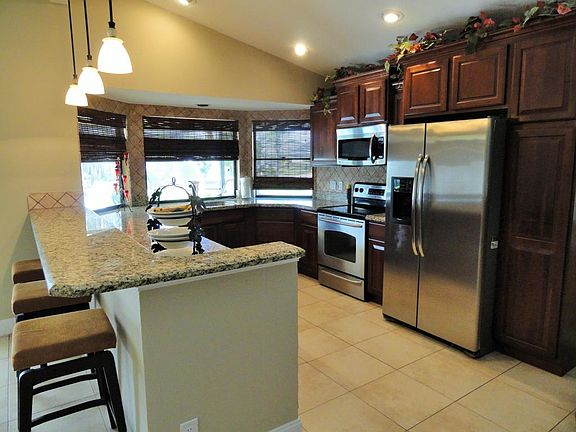 Sensational CBS pool home with prime corner location! LOTS of designer upgrades. Wide open, split bedroom floorplan featuring a private master bedroom ensuite with 8x9 sitting area/office, premium wood floors, double closets and gorgeous master bath. Updated kitchen with granite, stainless appliances and huge windows overlooking the pool. Decorator lighting and fans, vaulted ceilings (no popcorn!), skylight, crown molding, remodeled guest bathroom, inside laundry, freshly painted driveway & garage. A/C system in 2014 with transferrable warranty. Wood shake roof is only 10 yrs old and has been professionally maintained. 14x25 covered lanai offers lots of space for entertaining. Freeform pool with enclosure. Zoned sprinkler system on it's own well. Nothing to do! Move-in and enjoy!