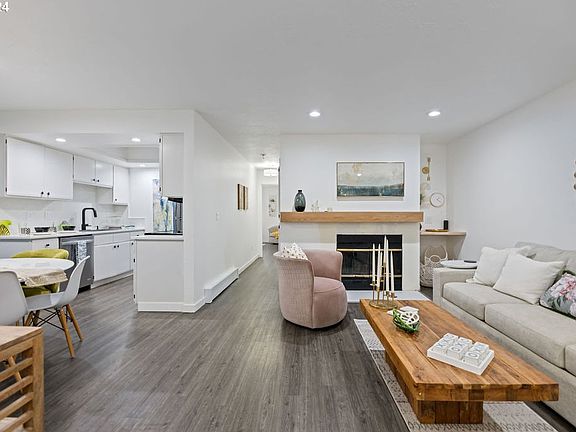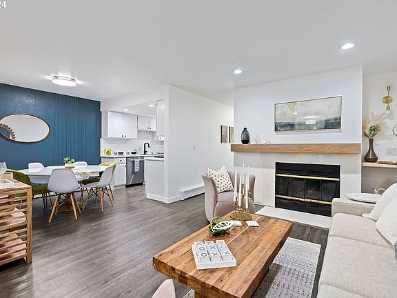 Welcome home to Mountain Park! This amazing Lake Oswego ground level condo offers everything! Updated throughout, this 2 bedroom, 2 bathroom unit includes: LVP flooring, bright interior paint, trim, quartz countertops, SS appliances, new fixtures, hardware, tile backsplash and lighting. A new custom white oak floating mantle can be seen as you enter the unit above the newly tiled fireplace surround and hearth along with a floating butcher block writing area. The dining room with its spacious eating area has a feature wall and sliding glass door to the covered patio and storage area. Just down the hall is a storage pantry adjacent to the laundry closet that includes wood shelves and w/d. The primary bedroom is large with plenty of space for a king bed and surrounding furniture.The MP community center includes an indoor pool and recreational facility and the neighborhood itself has beautiful parks, tree line streets, trails galore and all the amenities you need close by in walking, biking or immediate driving distances.