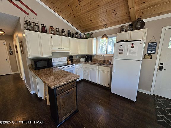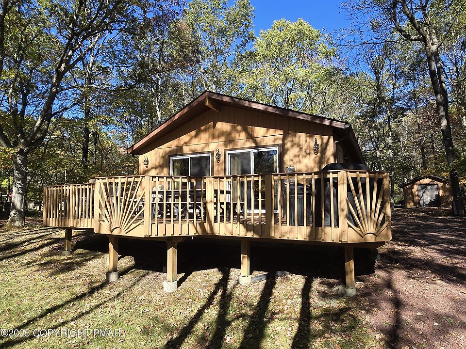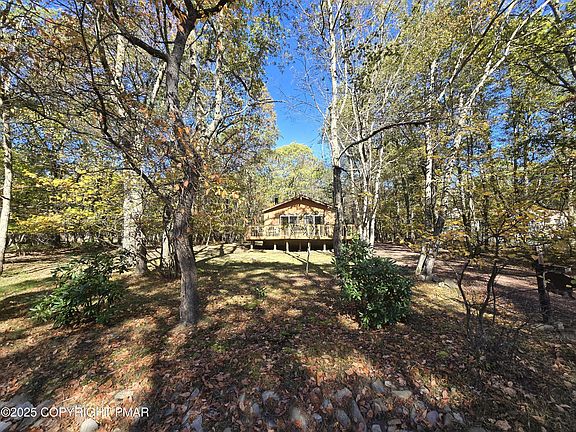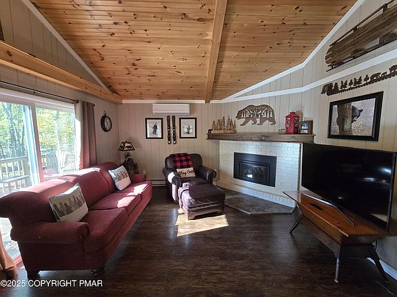 Welcome to your perfect Pocono escape! Nestled on a serene, wooded 1-acre lot in the Bear Creek Lakes community, this charming 3-bedroom, 1-bathroom ranch home offers the ideal blend of rustic charm and modern comfort. Step inside to an open-concept living area featuring a gorgeous pine wood ceiling and a cozy propane fireplace that sets the perfect tone for relaxing or entertaining year-round. Two large sliding glass doors lead to a spacious front deck, ideal for sipping morning coffee or enjoying peaceful evenings surrounded by nature. Whether you're looking for a full-time home, weekend getaway, or investment property, this home offers strong rental income potential thanks to its prime location near all Pocono attractions—including hiking, skiing, lakes, and more. Additional features include a large storage shed, a firepit area for outdoor gatherings, and access to the Bear Creek Lakes community amenities like the lake, beach, pool, and clubhouse. Don't miss your chance to own this tranquil woodland gem—schedule your private tour today!