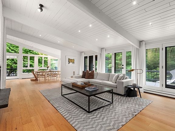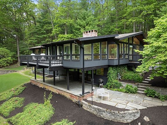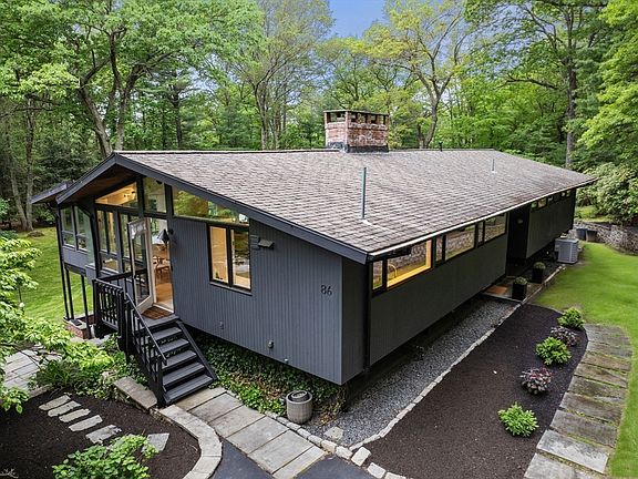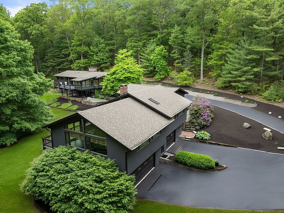 Modern Weston retreat on 2.3+ private acres at the end of a cul-de-sac. The main home is a sun-filled contemporary with 5 spacious bedrooms, 3 full baths, and an open layout featuring soaring ceilings, walls of glass, and tranquil garden views. The renovated, sleek kitchen with abundant cabinet and counter space, a Sub-Zero fridge, Miele oven, and induction cooktop, flowing into a spacious dining room and living room with double sided fireplace. An oversized game room with fireplace and hot tub provides space to relax. Multiple decks and patios extend living outdoors amid lush lawns and mature trees. The detached guest house includes a great room, bedroom, bath, & home office—ideal for guests, work, or creative use. Don't miss the sauna, heated garage parking for 6 vehicles and ample storage. Access top Weston schools, miles of conservation trails, the commuter rail and major routes. This special property blends privacy, modern comfort, and timeless design.