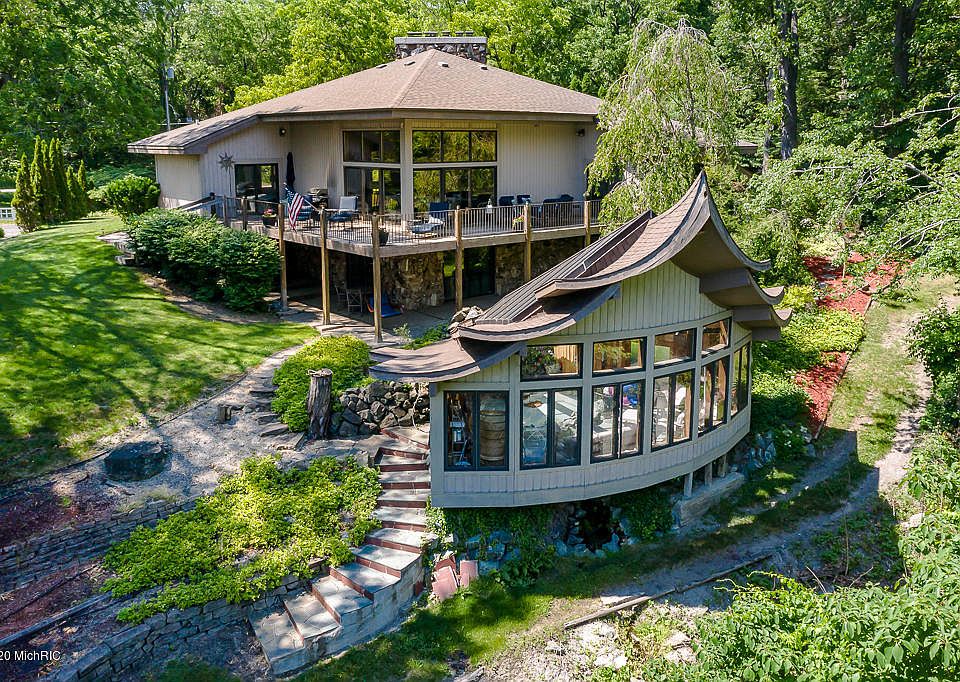 One of a kind showcase contemporary home on Bear Lake. Enjoy priceless views from the stunning wall of windows of this 1.66 acre estate. The large wrap around deck overlooks Bear Lake, flowing ponds and abundant wildlife. 130' of frontage on Bear Lake. Spectacular California Driftwood Stone fireplace is the center piece of the main floor. Solid hickory kitchen cabinets & doors, food warmer, thick granite counters, walk in pantry, and center island. Family room & bar room with glass ceiling overlooking the Japanese Garden. The master en-suite has a large sunken walk in closet, tile shower & slider to the deck. The daylight walkout lower level has a large 2nd family room, bedroom, 2 full bathrooms, sauna and covered patio. Gorgeous Japanese Pagoda.