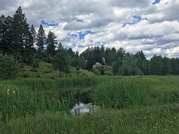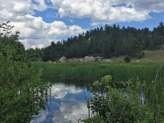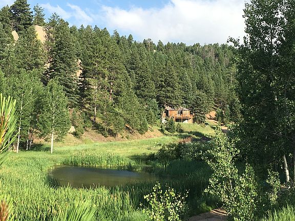 Spacious mid-century residence with endless possibilities! The home boasts a retro-cool fireplace, detached garage+carport, wrap around deck, and a stunning pond. Part of Bear Creek Ranch, an 1800s homestead tucked into a lush canyon just 30 minutes from Castle Rock, this offering features Ponderosa and Blue Spruce pines, abundant Aspen, large rock outcroppings, and meadows. The west side of this parcel is wooded and has absolutely incredible views. Just a few miles from the South Platte River, Rampart Range, and abundant trails and activities. There are a total of 163 acres available and several options for purchase. Call for more information on the options.
