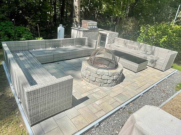 This Four bedroom home is drastically reduced!!The private backyard has a large patio with a bar, built-in grill and fire pit There is a large wooden frame for a projection screen. If that isn't enough there is a pad for a hot tub and a volleyball/bocci court. If you don't want a volley ball court it would make a nice play area for the children. You don't have to leave home to have fun! The front yard can be a mini-golf course or croquet! And of course the bright and sunny home offers a quiet den as you enter from the side that opens to the newly remodeled kitchen! A real gem. The kitchen is open to the front to back living room that boasts a pellet stove, hardwood floors and lots of windows! The dining room has hardwood floors presently and being used as a music room. The half bath is combined with the laundry room on the first floor. The second floor has hardwood floors throughout the four bedrooms and has a full bathroom Platinum HOME WARRANTY INCLUDED OPEN HOUSE Sunday February 19th 12:00-2:00