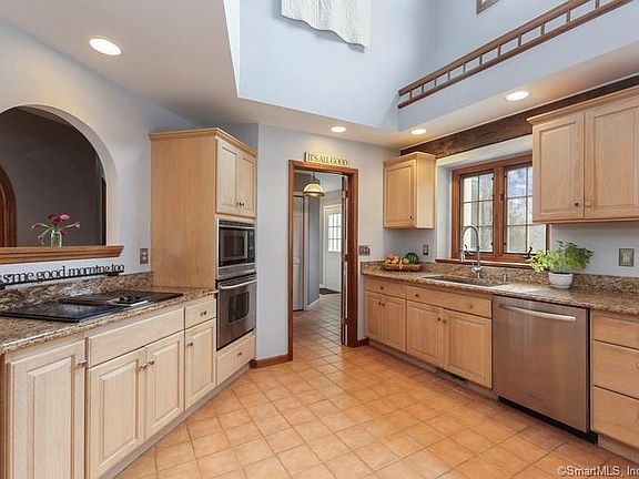 Privacy and serenity greet you as you drive up to this truly unique and captivating New England Colonial. Inviting, spacious rooms, gleaming wide-plank cherry hardwood floors, high ceilings, skylights and a warm and open floor plan are some of the outstanding features of this sunny home, perfect for today's lifestyle. The chef's kitchen is the hub of the house and features stainless steel appliances, granite counters, a breakfast nook and opens to the bright family room with impressive stone fireplace. Sliders lead to the beautiful screened in porch and multiple decks. The living room has a lovely fireplace and adjoins the library with built in bookshelves and an inviting window seat. The attached two car garage leads into a mudroom with a pantry and workspace with a built in desk. Two half baths complete the first floor. Upstairs, the generous master bedroom suite features high ceilings, his and hers walk in closets and a spa-like bath with soaking tub, open style shower and dual sinks. Three other bedrooms, two ensuite full baths, and a spacious laundry room complete the second floor. The walk out finished basement is perfect for a playroom or workout room. Set on over 5 bucolic acres, within easy walking distance to Weir Farm National Historic Park, and located in an enclave of homes providing a friendly, neighborhood community feel, this home is minutes to both Wilton and Ridgefield town centers and is the perfect opportunity to enjoy all the benefits of two great towns