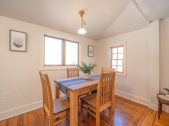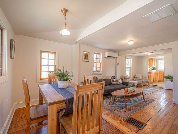 Inside, the home features an open-concept living and dining area filled with natural light, creating a cozy setting for everyday living and entertaining. The kitchen, though compact, is efficiently laid out and open to the living and dining area, giving it a spacious feeling. The first-floor primary bedroom sits conveniently near a half bath. Upstairs, you'll find two additional bedrooms, a bonus room that connects the two bedrooms (reading nook? plant room? sewing room? lots of possibilities!), and a full bath, all with their own unique charm.