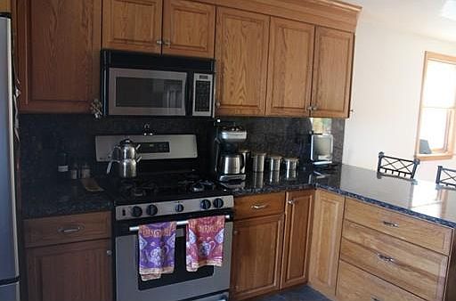 - Kit Dscrp: Countertops - Stone/Granite/Solid, Flooring - Stone/Ceramic Tile, Stainless Steel Appliances, Balcony / Deck, Gas Stove, Peninsula