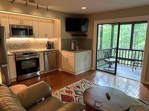 This renovated 1 bedroom condo in the heart of Big Canoe is the perfect mountain getaway!! The condo features new custom cabinetry, granite countertops, custom lighting and new stainless steel appliances in the kitchen that opens to the living area with hardwood floors, new lighting and access to the screened in porch that overlooks the rock slide, which offers a year round sound of a waterfall. The spacious bedroom features 2 closets and an updated bath with granite countertops, new flooring and fixtures. There is also a bunk room for the smaller guests to use, as well as a laundry area and storage room/pantry. All new appliances, water heater & AC unit. Some furnishings are included in the sale of the home. This is perfect for a vacation rental or 2nd home and it won't last long!