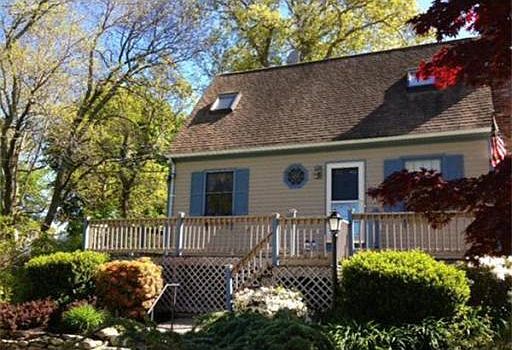 Nestled down a quiet street abutting conservation, is where you will find this delightfully well maintained home. Light, bright and open floor plan designed for easy living. Updated eat-in kitchen with stainless appliances, granite countertops and gleaming hardwood floors! A slider off the kitchen/dining area, leads to a private backyard, lush landscaping and wrap around decking.The living room is enhanced with a fireplace and french doors which open to the family room with vaulted ceiling and hardwood floors.The newly carpeted 1st floor bedroom is currently used as an office, full bath, and a bonus 4 season sunroom completes the first floor. The second level leads to two bedrooms and a full bath with tiled walk in shower. Laundry and tons of storage, including a cedar closet are located in the full basement. Close to beaches, boating and more! Perfect home to start your family memories!