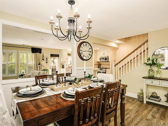 Super charming end unit 3 bedroom 2.5 bath immaculately maintained condo. This home feels like it jumped out of a village in England as is the entire vibe of the Three Vines neighborhood. Previous model for Three Vines Neighborhood. The only unit with a 3 car garage and the only street with drive way parking as well. Garage has been fully upgraded with custom storage and epoxy flooring. Oversized back yard surrounded by trees and includes above ground spa. Interior with hardwood floors and all upgraded and updated finishes. Town home is located in the coveted Ladera Ranch neighborhood with blue ribbon schools and multiple parks, pools, hiking trails, skate park, tot water park, festivals and community events. Townhome has open concept living through out and upstairs laundry. This private and cozy end unit home is move in ready and sits off the rose garden courtyard.