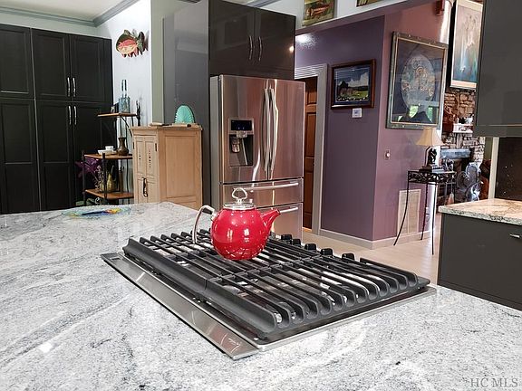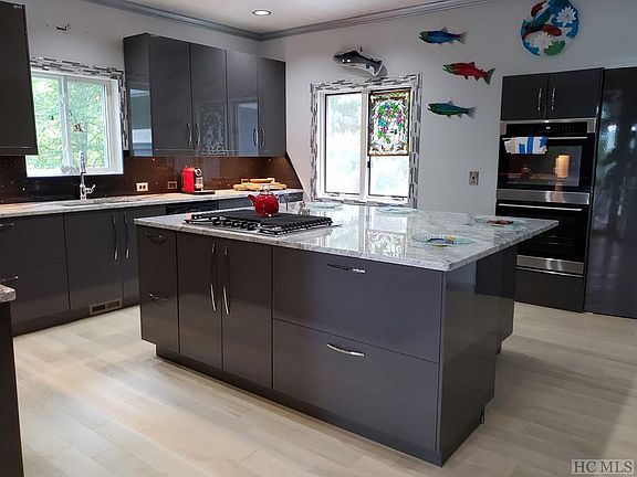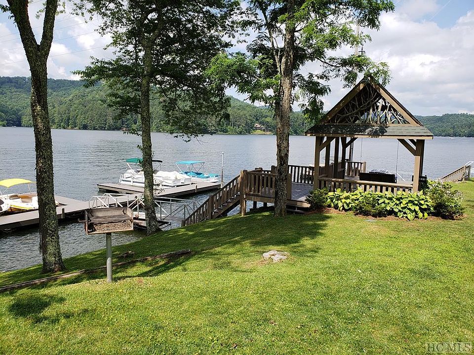 Fabulous Lake Glenville location overlooking your private boat slip in Cedar Point Landings and the widest part of Lake Glenville with the mountains beyond. The entire lower section of the wall of glass overlooking the lake opens accordion style transforming the living room to a virtual screened outdoor space with 2 fireplaces one wood burning and one gas log to make this experience complete. The newly remodeled kitchen is a chefs delight. The huge master suite with a sitting area complete with a chandelier and gold leaf gas log fireplace opens to the screened outdoor living space overlooking the lake. In addition the master bath features an oversize jetted tub, separate shower and 2 skylights. From the upstairs bedroom step out onto the rounded indoor balcony overlooking the living room with its floor to ceiling rock faced fireplace, open beam cathedral ceiling, massive chandelier and an impressive view of the lake beyond. The downstairs one bedroom apartment, mother-in-law suite or guest quarters has an additional kitchen, laundry room, living room with gas log fireplace and a large open wrap around covered deck overlooking the lake. For the boating enthusiast, your private boat slip at the gated "Members Only" Cedar Point Landings is just steps away consisting of a beautifully landscaped peninsula with gazebo, barbeque grill and restrooms. What a wonderful place to spend the day!