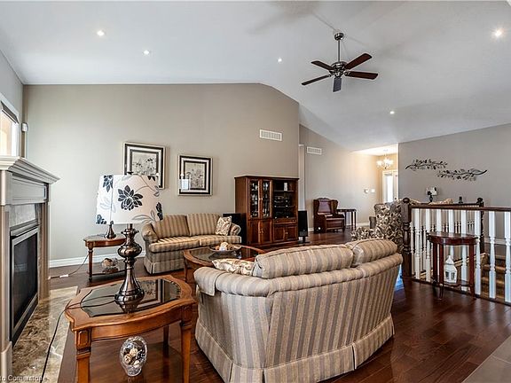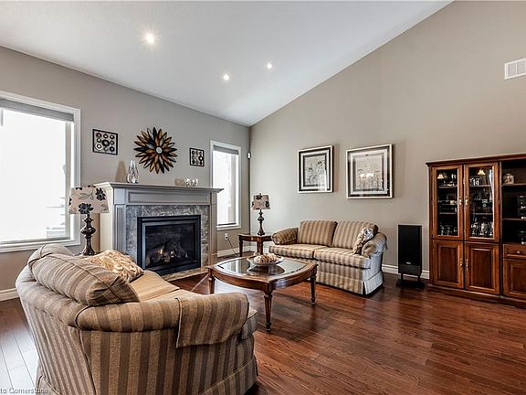 A remarkable bungalow in the quiet community of St. George. 1/3 of an acre, pie shaped-irregular lot, backing onto agricultural lands. This home was custom built 12 years ago, by the current owner. Extensive list of custom upgrades available upon request. Extraordinary attention to detail during the construction. Calm, neutral colours and finishes throughout. Open concept living area on the main floor, with patio access to the back yard. The main floor has 9 ft ceilings, with a 14 ft ceiling in the Great Room. Hardwood flooring on the main level, with carpeted bedrooms. The kitchen has lots of cupboards and a large centre island. The stove is electric, but the kitchen has a gas hookup if preferred. The basement has extra space for additional bedrooms. A small room at the bottom of the stairs, could be converted to a second kitchen. Beautifully landscaped front and backyards. Enjoy the beautiful sunrises from the backyard, over the rural landscape. Seller has pre-paid for Sprinkler system Maintenance (open, summer check & winterize). As well as lawn maintenance (Fertilize X3 & weed spray x 2) St. George is a small community, which is conveniently located within a short drive to Brantford, Hamilton, Burlington and Guelph. Easy access to highways.