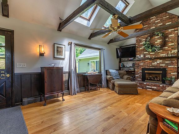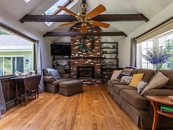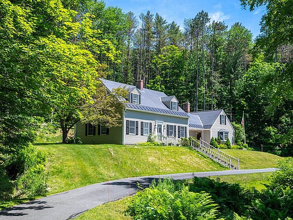 This classic expanded Cape Style Home is located on a quiet dirt road within walking distance to The Village Green, and just steps to King Farm and the Mt Tom Trail system. Plenty of room to sprawl about in the generous common spaces. The living room has oversized windows and anchored by a brick fireplace flanked by built in book shelves with a propane stove insert. The dining room has a wood burning stove. The open concept kitchen has stainless steel appliances, tile floors, and plenty of counter space to cook for a crowd. The main rooms all have beautiful hardwood floors. To further complete the main level there are two bedrooms and a 3/4 bath. The second level has two more bedrooms with hardwood floors and 3/4 bath. There is finished space in the basement for a playroom or hobbies. There is an attached accessory unit that is the perfect spot for guests and family, or as an income producer. It has galley kitchen, LR/DR with hardwood floors and propane stove, one big bedroom with sliders to the back yard, and a loft for guests or office. The grounds are lovely with established perennial beds and mature plantings. There's a trickling little stream that laces through the property. Great terraced area for your vegetable gardens. Close proximity to DHMC, Dartmouth College, Upper Valley, Killington Mountain