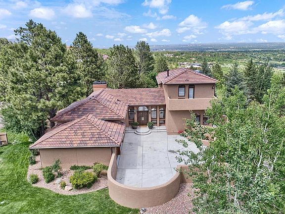 Luxury Mediterranean style home with Amazing Mountain and City Views located just minutes from the Broadmoor and Cheyenne Mountain Zoo. Kitchen offers white custom shaker cabinets with hardware, white subway tile backsplash, white granite countertops, SS appliances and wood floors. Dining room off the kitchen has an island with granite top and 6 burner gas grill. Main floor Master offers sitting room,office and private bath with 9x6 shower and warming towel bar. All bedrooms have private walk out decks with views & full baths! Rear patio is perfect spot for BBQ with Views of Colorado Springs lights! Family Room has a fireplace with remote controlled gas logs and wet bar. Lovely hardwood floors in living room, family room, kitchen and dining areas. Enjoy morning coffee on private patio while listening to the lovely melodies being played every 15 minutes from Will Rogers. Property is low maintenance and well maintained. Feel like a tourist in your home!