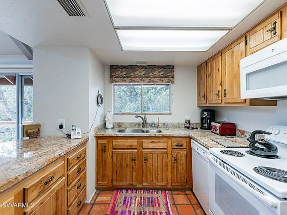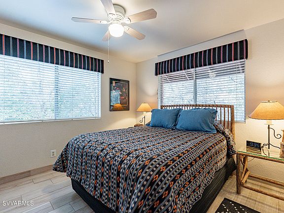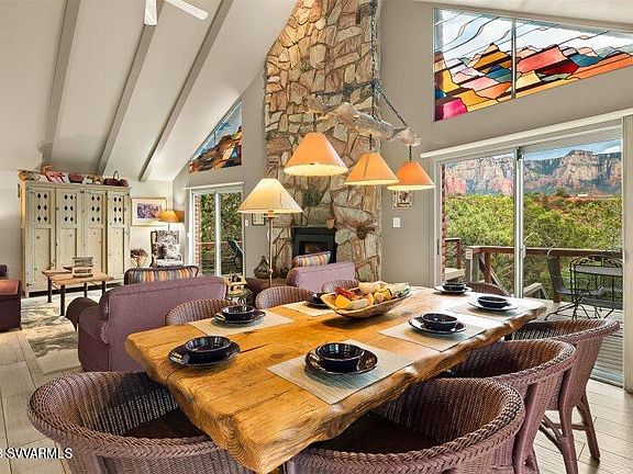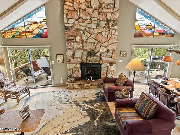 Jaw dropping protected panoramic red rock vistas. Home & acreage is well above the flood zone. No HOA. Rural setting, prime uptown location. Deck, sunken hot tub, privacy. Furnishings custom designed & built for the home. Great room showcases one of a kind pair of stained glass windows created & signed by renowned artist Thomas Maze Aderhold which flanks soaring stone sealed gas fireplace, porcelain tile flr. Granite countertops & serving counter to great room, authentic Saltillo tile flooring, vintage warm wood cabinetry, brass hardware in kitchen & baths. Walk-in stone shower. Iridescent glass tile, full bath 2nd floor. Modern HVAC Multiple seating areas throughout the property amidst towering juniper, cacti, varieties of birds, wildlife. Mule deer, javelina, quail, rabbits often frequent the landscape.