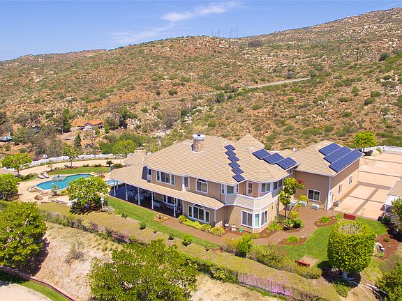 PRICE REDUCTION! Live life on Camelot in this exceptional, hilltop estate with panoramic views, privacy and unbelievable indoor and outdoor amenities designed for entertaining and spending time with family. This approximately 1 acre gated property is located on Shadow Mountain in Granite Hills. Enjoy a state-of-the-art home theater, beautiful two-story entry with inlaid wood flooring, an updated kitchen with granite counter tops, an office with dual built-ins, laundry rooms on both levels and a master suite complete with fireplace, oversized walk-in shower, Roman tub and large walk-in closet with built-ins. The first floor features a second master bedroom which has a private entry and an ensuite bathroom with its own deep tub and separate shower. The pleasures continue with a resort-style pool, separate spa, an outdoor kitchen, and an outdoor living space with a large stone fireplace. Completing the outdoor entertaining areas are a fire ring, horse shoe pit and a pool house with a shower and sauna. This very private and quiet estate is like new. Solar keeps the electric bill down and a private well is currently used for landscaping needs. Property also has two large garages including one for recreational vehicles which features a hook up and a dump station. Additional quality can be found in the 2x6 construction and the five separate heating and cooling zones. The house was built by a designer/builder as his personal residence ensuring quality throughout. Don't miss this chance to own your own piece of Camelot.