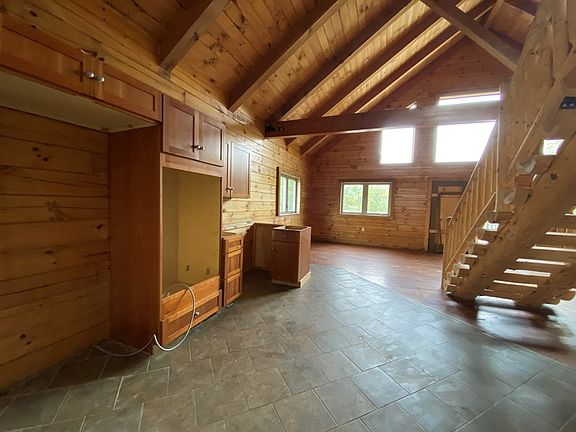 This beautiful log home that has a fantastic view of a peaceful pond with a private 5+ acre setting. The overall look in this home is stunning and still ready for your finishing touches. Both bedrooms have their own full bathrooms. The full unfinished basement with poured walls has 2 more possible bedrooms and an open area that walks out to the pond. The second floor has a balcony and the first floor living room opens up to a large deck overlooking the pond. Both entrances have handicap assessable ramps.