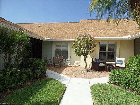 Fabulous golf and water views from this 2 BR 2BA turnkey furnished villa with 2 car attached garage. New roof 2017. Newer water heater. Kitchen remodeled with new cabinets (2008). Recessed lighting, GE dishwasher, cooktop stove, built-in microwave, Whirlpool refrigerator, built-in desk. Plantation shutter on kitchen window. Dry bar in foyer closet. Doors removed from LR to lanai to create year round space. Master BR & guest BR have Plantation shutters on the windows. Comfort level toilets. New sink in guest bath with tub and shower combo. Kenmore washer & dryer across from guest bath. 27 holes Arthur Hills designed championship golf course. Clubhouse with full service restaurant, grill room, Pro Shop, putting greens, driving range, practice sand trap area, 3 Har Tru tennis courts and lap pool. 5 miles to downtown 5th Ave. shopping, dining, art galleries, live theater and pristine Gulf of Mexico beaches. Easy access to I-75 No. and So. 25 minutes to Regional Southwest Fl airport. Close to Marco Island.