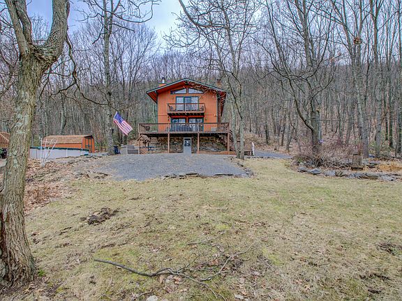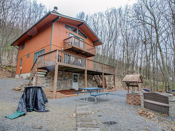 Raised Three Story Chalet in Pleasant Valley School District. This oversize raised chalet has 3 bedrooms, 3 full baths, on 1.65 acres of beauty. Lower level has a finished space that can be used as an exercise or game room or additional living space. The main floor has an open concept,a kitchen with plenty of counter space. 2 bedrooms, 1 bath, dining area and a cozy wood stove. The sliders lead out to a beautiful deck where you can sit and enjoy nature or perfect for entertaining. The top level family room with a stone-faced fireplace, Master bedroom with beautiful wood accents, 1 full bath, cathedral ceilings, spectacular windows, sliders all leading to the third story deck! Easy access to Interstate 80, PA Turnpike and many Pocono attractions. Do not miss this home!