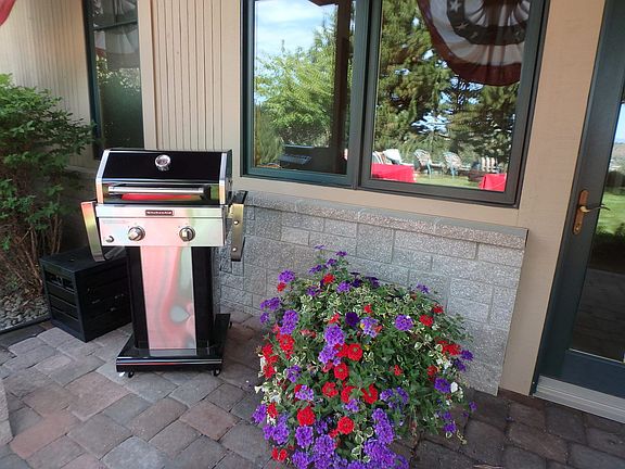 Beautifully landscaped yard and patio with BBQ, table, and chairs.