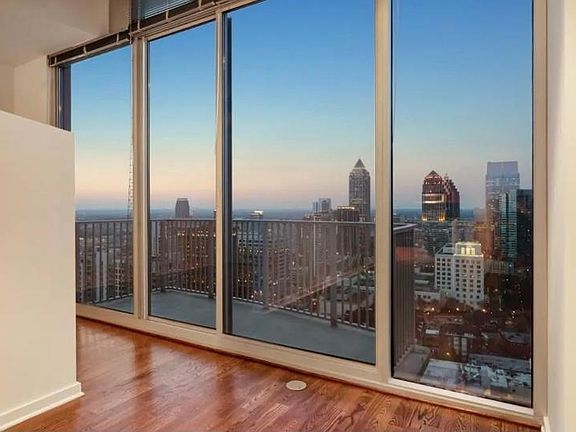 Own the Sky! A rare gem in the heart of Midtown w/ gorgeous, unobstructed panoramic views from high upon the Penthouse floor of spectacular Spire. 12'ceilings, floor to ceiling windows, balcony. Private bedroom, immaculate, very well maintained. Solid hardwoods, stainless, island, granite, concrete accents. Deeded parking space steps from the elevator. Large STORAGE UNIT accessible also from loading dock. Club room, theatre, cardio and weight room, pool plus the world just outside your door w/shops restaurants or hop on Marta at the Midtown Station.