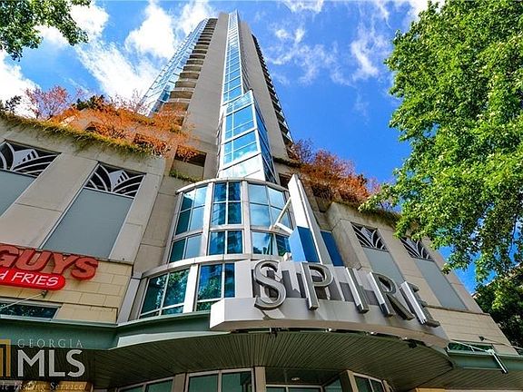 Soaring downtown views from the 18th floor at Spire! Split-Bedroom plan w/hardwoods through-out! 10' exposed concreted ceilings. Updated gray paint colors. Granite island w/dark stained cabinets views the dining area and living room w/balcony. Built-in desk area. Fridge, washer & dryer included. Master suite features his & her closets, double vanity, garden tub and separate tile shower. Spire features 24 hour concierge, club room, swimming pool, grilling area & fitness center. Walkable to restaurants, Fox Theater, GT, Piedmont Park and more!