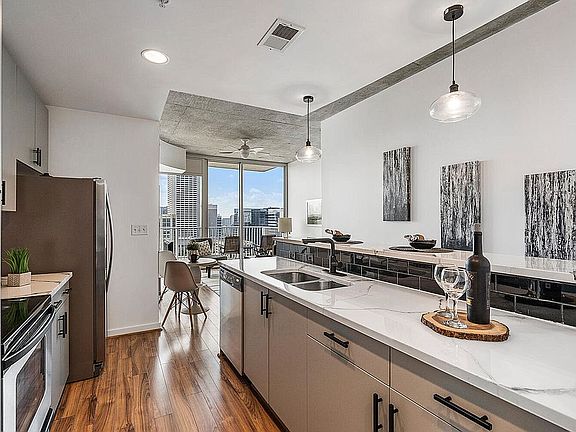Sunny 1-bedroom with spectacular downtown views from the 21st floor! Newly repainted, re-finished and move-in ready! Floor-to-ceiling windows, hardwood floors throughout, large balcony. Stainless steel appliances. Washer/Dryer in unit. Built-in desk area. Deeded parking space #56, conveniently located in front of the elevator entrance. Spire features a 24-hour concierge, fitness center, club room, swimming pool and grilling area. Walking distance to Midtown restaurants, Starbucks, The Fox Theater, MARTA, GA Tech, Piedmont Park and more. Spire Midtown, a most extraordinary place!