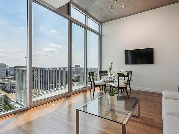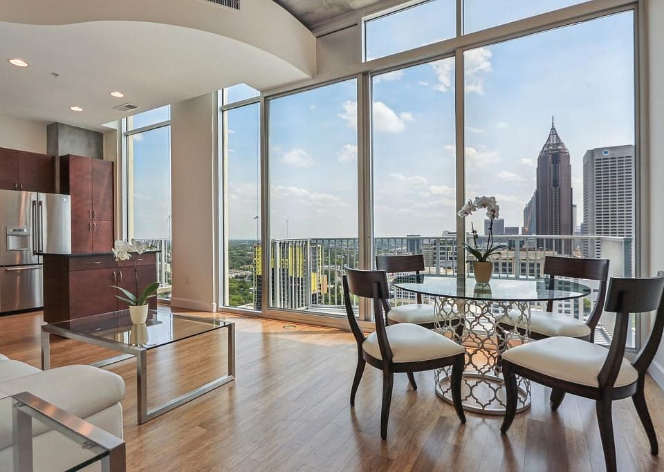 Carefree living on the top of The Spire. Instant equity as this home has virtually unencumbered southwest views of the Atlanta skyline which is quickly becoming a hot commodity. This is the best that condo living has to offer as this is a top floor home within a community packed full of top-notch amenities. Pristine wood flooring, fresh paint, stainless appliances, custom oak closet organizers, custom lighting & 12' ceilings (sealed concrete ceilings) and floor to ceiling windows will exceed expectation! As well as the Atlanta night life outside the door, the 24 hour concierge will be the new cornerstone of your new life in Midtown! Access to Piedmont Park, restaurants, pubs and mass transit are within blocks. Storage unit is available for purchase with the home.