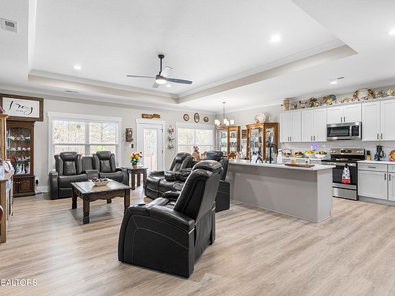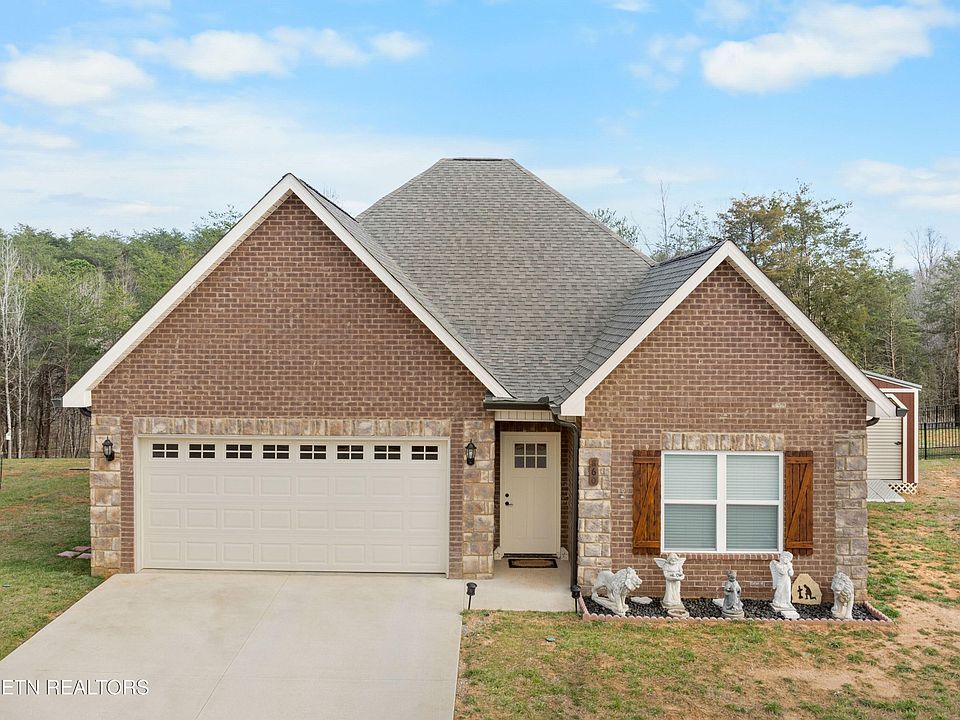 Welcome to 860 Pinebrooke Drive, a beautifully maintained home located in the desirable Pinebrooke Point community of Maryville, TN. Built in 2023, this nearly new home sits on a spacious 0.69-acre corner lot and features 3 bedrooms, 2 bathrooms, and 1,761 square feet of thoughtfully designed living space. The open-concept floor plan boasts a large living area with a tray ceiling, crown molding, and luxury vinyl plank flooring throughout. The kitchen is outfitted with quartz countertops, shaker-style cabinetry with taupe lowers and white uppers, stainless steel appliances, a generous island with bar seating, and pantry. The split-bedroom layout offers privacy with the primary suite featuring a vaulted ceiling, oversized walk-in closet, double vanities, and a beautifully tiled walk-in shower. Two additional bedrooms share a full bathroom, and the separate laundry room provides additional storage and convenience just off the two-car garage. Outside, you'll find a covered back deck overlooking the partially fenced backyard, enhanced by a black aluminum fence and a professionally installed irrigation system with front and back yard zones controlled by a timer. A permitted, HOA-approved 12x12 storage shed offers even more space. Nestled in the tranquil rural outskirts of Maryville, this home offers a peaceful retreat from the hustle and bustle—while still being just minutes from shopping, dining, and everyday conveniences. Zoned for Lanier Elementary, Carpenters Middle, and William Blount High School, it blends quiet country living with modern comfort and accessibility. Don't miss your opportunity to make this exceptional property your own—schedule your private showing today!