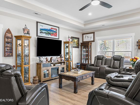 Welcome to 860 Pinebrooke Drive, a beautifully maintained home located in the desirable Pinebrooke Point community of Maryville, TN. Built in 2023, this nearly new home sits on a spacious 0.69-acre corner lot and features 3 bedrooms, 2 bathrooms, and 1,761 square feet of thoughtfully designed living space. The open-concept floor plan boasts a large living area with a tray ceiling, crown molding, and luxury vinyl plank flooring throughout. The kitchen is outfitted with quartz countertops, shaker-style cabinetry with taupe lowers and white uppers, stainless steel appliances, a generous island with bar seating, and pantry. The split-bedroom layout offers privacy with the primary suite featuring a vaulted ceiling, oversized walk-in closet, double vanities, and a beautifully tiled walk-in shower. Two additional bedrooms share a full bathroom, and the separate laundry room provides additional storage and convenience just off the two-car garage. Outside, you'll find a covered back deck overlooking the partially fenced backyard, enhanced by a black aluminum fence and a professionally installed irrigation system with front and back yard zones controlled by a timer. A permitted, HOA-approved 12x12 storage shed offers even more space. Nestled in the tranquil rural outskirts of Maryville, this home offers a peaceful retreat from the hustle and bustle—while still being just minutes from shopping, dining, and everyday conveniences. Zoned for Lanier Elementary, Carpenters Middle, and William Blount High School, it blends quiet country living with modern comfort and accessibility. Don't miss your opportunity to make this exceptional property your own—schedule your private showing today!