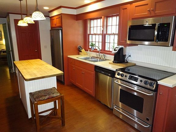 - Kit Dscrp: Main Level, Dining Area, Flooring - Hardwood, Closet/Cabinets - Custom Built, Kitchen Island, Stainless Steel Appliances, Fireplace, Recessed Lighting, Window(s) - Bay/Bow/Box, Exterior Access, Country Kitchen, Cable Hookup, High Speed Internet Hookup, Lighting - Pendant, Crown Molding