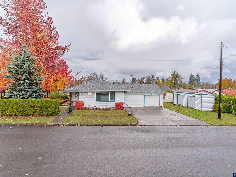 Fantastic starter home! Update ready, this easy floorpan is ready for new owners! The interior features a bright living room, dining area, and a kitchen with plenty of storage. Both bedrooms are well sized with charming built-ins in each room. The oversized garage has extra space and a finished office space. If that doesn't cut it, outside features a 2 stall, metal storage shed for even more space. The property is subtly lined by trees giving this corner lot extra privacy. A must see loaded with potential!