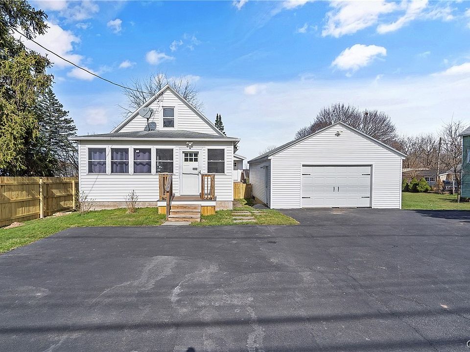 This 3 bedroom ranch on nearly 3 acres with views of Onondaga Lake is a must see. There is a huge driveway with parking for multiple cars and a detached 2 car garage. Step into the enclosed front porch with sitting area, which leads to the well appointed entrance foyer/sitting area with hardwoods and the expanded living room that added 80 sq ft of living space. The hardwoods continue into the formal dining room area, off of which is the first bedroom-also with hardwoods. This opens into the updated kitchen with stainless appliances, newer backsplash, sink and solid surface counters. Off the kitchen is an updated full bath, and separate first floor laundry area with newer washer/dryer! Continue down the hall to find a spacious primary bedroom, another good sized bedroom (both with hardwoods) and a half bath. Don't miss the walk-up attic with witches stairs! There is a side entrance outside to a fenced in area, perfect for pups! Beyond that is a huge, park like, nearly 3 acre lot with views of Onondaga Lake! Note the walk-out basement entrance in back as well. Great convenient location, on Solvay electric and close to Rte 690, Route 81, and the NYS Fairgrounds! Showings start 4/5.