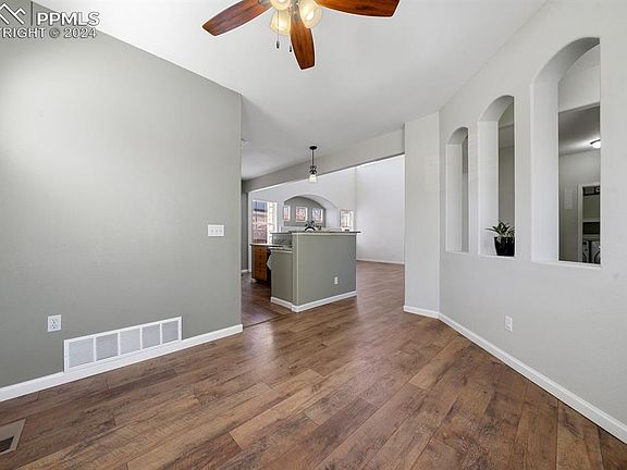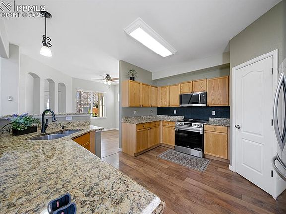 Built in 2000. Step in and enjoy the great room as the kitchen is open to the large two story living room with gas fireplace, luxury laminate plank flooring and don't forget to check out the secret room under the stairs. New stainless steel LG appliances, granite countertops with large island and walk-in pantry make this a true chef's kitchen. Upstairs you'll enjoy new carpet throughout. The primary bedroom with vaulted ceiling has a beautiful attached bath with dual vanities, granite countertops, walk-in shower and large soaker tub. Jack-n-Jill bath for the two additional bedrooms upstairs. Great enclosed backyard space with an amazing peach and pear tree. Quiet Genie garage door opener and Rheem water heater recently installed. Roof, furnace, central AC all 5 years or newer. Washer and Dryer included. All lights in the house are LED. All this conveniently located in a cozy neighborhood between Fort Carson and Peterson AFB.