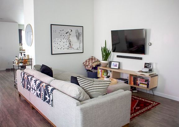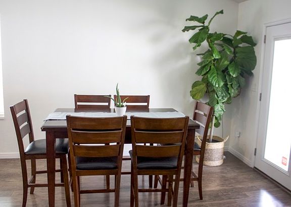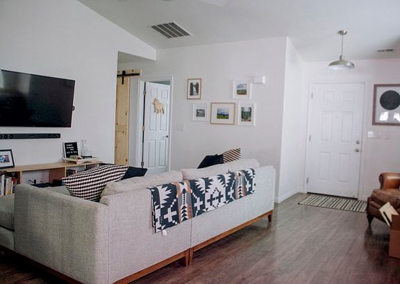 Open floor plan with laminate, wood, and tile flooring throughout (no carpet)