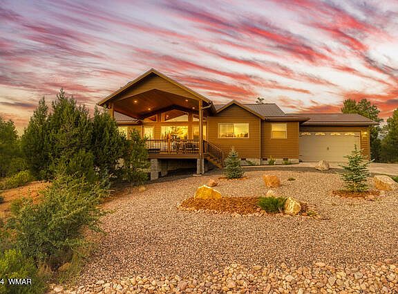 Escape to serenity with this 2,320 sq. ft custom home nestled within the prestigious gated community of Snow Creek located in the cool White Mountains of AZ. This 3 bd/2.5 ba home is located at the back of the subdivision for maximum privacy and offers fabulous long range mountain views. The home boasts a split floor plan that is crafted for comfort, style and functionality. As you step inside, the expansive great room captivates with its floor to ceiling stone fireplace, rich wood ceiling and durable low maintenance flooring. The oversized windows frame the panoramic views, inviting the stunning outdoors in. Every detail from the solid 8 ft wood doors, elegant granite countertops and gourmet kitchen exudes quality. The oversized 2 car garage provides ample room for your vehicles, outdoor gear, or mountain toys, ensuring you're ready for every outdoor adventure. Step outside to your private backyard OASIS, where you can unwind while watching the resident elk herd gracefully roam through your property, a true connection to nature. Alternatively, relax on the spacious front deck soaking in the sweeping mountain views and vibrant, awe inspiring sunsets that paint the sky. For those dreaming of even more space, there are approved plans for a wrap around deck plus the adjoining .51 acre lot is available for purchase, offering endless possibilities to create you ultimate mountain retreat.
