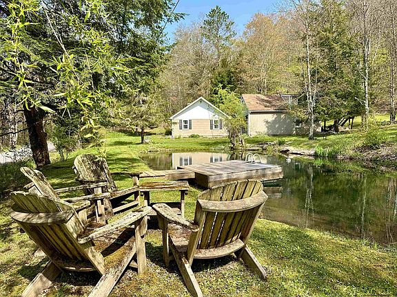 Built in 1940, this charming home is a nod to a simpler, gentler time - How Sweet It Is! Located on a scenic, quiet country road, the approach to the property is quintessential country. The home has 2 bedrooms, 1 full bath, a kitchen, living room, dining area, mud room and is loaded with charm. The living room features hardwood floors, a beautiful stone fireplace with a insert, a large picture window and wood trim throughout. With period cabinetry, the cozy kitchen is a ideal place to prepare your culinary masterpieces. The two bedrooms are separated by a small hallway and linen closet. Just off the bedroom hallway is the bathroom. The rear mudroom is an essential element for country living and offers plenty of storage space.. The detached garage is a great place to store recreational gear, garden tools or seasonal furniture. Above the detached garage is a very sweet separate studio living area complete with it’s own full bathroom featuring vintage fixtures - so cool. Off of the studio is an elevated deck ideal for enjoyment of the beautiful and peaceful surroundings. Recent upgrades include a new DEP installed septic, a new electric panel, two new water heaters and a french drain. The land is an exclamation point to this sweet property. The spring fed pond is sure to give hours of enjoyment whether swimming or floating around on a summer day, watching the wildlife that come to enjoy it’s clear waters or just listening to the sound of the small natural waterfall! The pond’s swimming dock offers ease of access and a nice place to soak in the sun. The parklike setting features a fire-pit, a bluestone patio and lightly wooded meadow. Minutes to the destination village of Andes you are close to hiking, boating on the Pepacton, art galleries, restaurants, skiing and so much more. About 2.5 hours from NYC - this is a wonderful country retreat!
