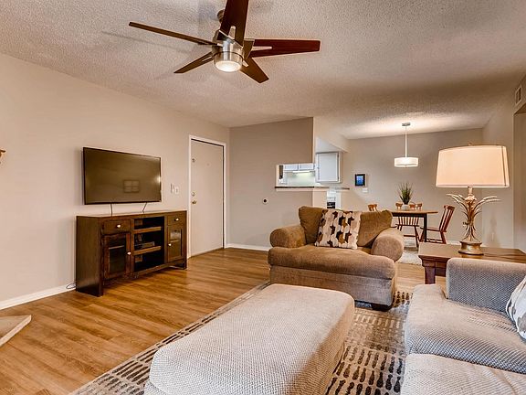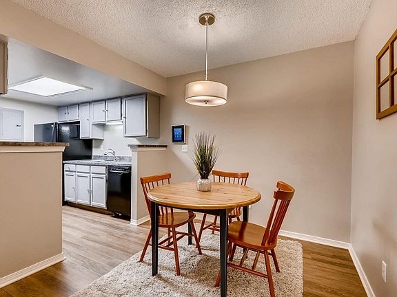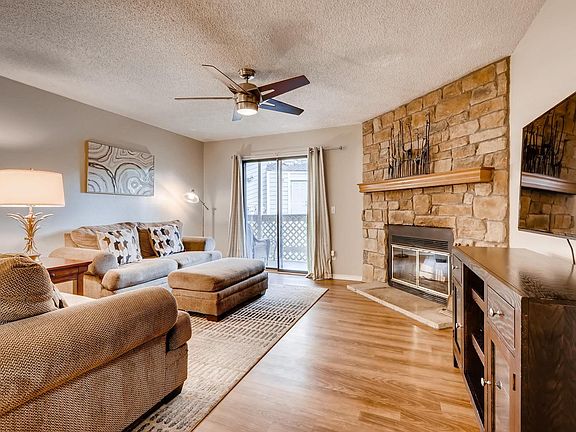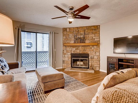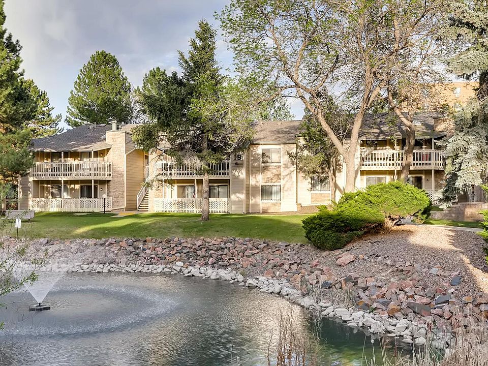 Coveted interior end unit condo with covered patio facing a lovely pond and water feature. Updated with designer bathroom tile and enclosures. Master bedroom is huge, with en-suite bathroom and large walk-in closet. Second bedroom features a sliding door to the covered patio. Cozy up to your wood-burning fireplace in the living room, with view of pond out your sliding door. Kitchen has updated appliances and opens to dining room. Laundry room with full-size washer and dryer included. Reserved parking space close to the unit. Great location in Lowry area near Beer Garden, shopping, restaurants and close to walking trails.