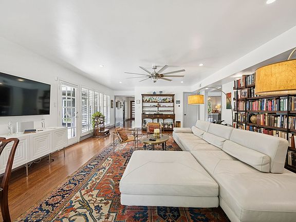 Sparkling poolFloor-to-ceiling windowsHardwood floorsResort-style backyardNatural lightMultiple patiosFirst-floor primary suite