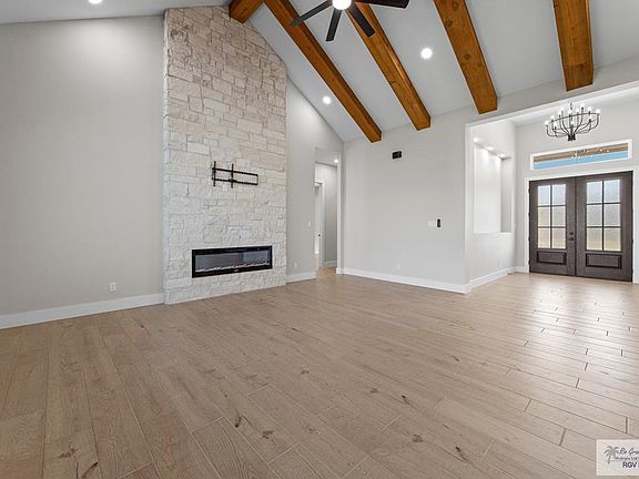 Gorgeous 4 bed, 2.5 bath, 2508 sqft home on a corner lot! This 2025 built single story beauty is packed with charm from the floor-to-ceiling stone electric fireplace to the wooden ceiling beams that make the living space feel warm and inviting. The kitchen is ready for your inner chef with a gas stove hookup (plus electric option). Primary suite has his & hers closets and a spa-like feel. Enjoy 2 HVAC units for comfort, full irrigation front & back, fenced yard, and AT&T fiber already installed. Energy efficient design means lower electric bills! No HOA and this home stayed dry during recent major storms!