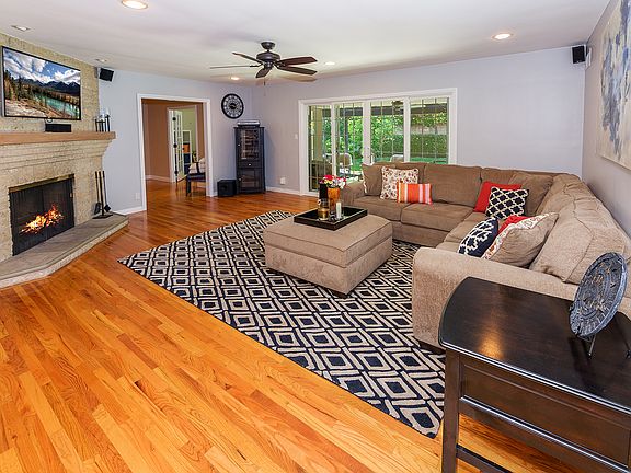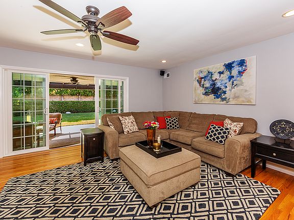 This gorgeous 3 bed, 3 bath, plus den home is light, elegant, and charming. With recent upgrades to fit the modern buyer, this home has all the features you could want in one single home. Picture-book curb appeal leads you through red double doors into your wide formal entry with ceramic tile flooring, recessed lighting, and high ceilings. Inviting, spacious living room has been newly painted with surround sound, a striking stone fireplace and french doors opening up to the lush backyard. Oak hardwood flooring is present throughout every room as well as triple paned doors & windows, recessed lighting throughout, and custom fans. Upgraded kitchen has granite counters and stainless steel appliances with glass tile backsplash, double sink, lovely rich cabinetry with drawer glides and breakfast bar. Stainless appliances include wine cooler and designer vent hood. Master suite, living room and den open to the charming lush backyard.