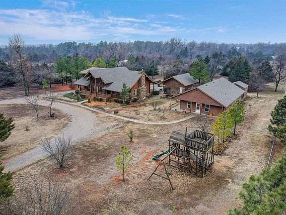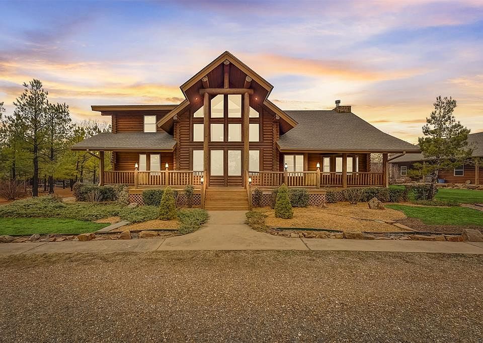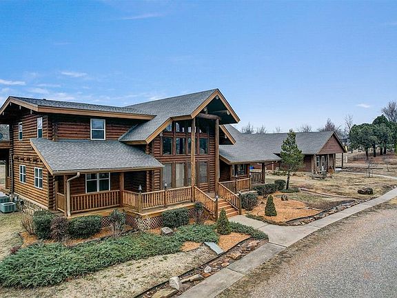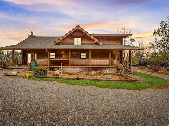 This beautiful log cabin is a DREAM come true! This 2-story log cabin is nestled on 5 acres with guest quarters, woodworking shop, a "she shed", covered pavilion, above ground pool, 3 car detached garage and several outbuildings. The main house contains 2400 sq ft (MOL), including three bedrooms, two and a half baths, a loft and balcony upstairs. The master suite is located downstairs which has a cedar-lined closet and large bathroom. The front and back porches span the entire length of the house perfect for watching the sunset. The large open kitchen has custom built cabinets made of knotty alder wood. The 1000 sq ft (MOL) guest house has 2 bedrooms, a large bathroom and laundry room. There is a woodworking shop on the back end of the guest house which has access to a large attic space. There is 3-car detached garage with cabinetry and a large attic space with stairs to access attic. The property offers a picnic pavilion next to the above ground pool with deck and built in benches. There are several smaller buildings on property that could be used as storage. There is also a "She Shed" that was used as an office, craft and sewing room. The owner had the main house sandblasted and re-stained approx. 2 years ago. Every building on the property received a new roof in August 2023. Both main house and guest house have central heat and air. The main house has a wood-burning fireplace/insert that is quite capable of heating the entire house. Buyer to verify all information including but not limited to schools, square footage, etc.