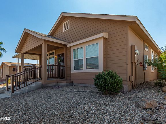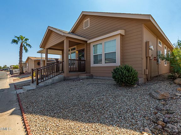 Move-in ready! Paid in full Solar. Adorable mobile housing in the desired Sun Garden Estates! The 2-carport spaces and cozy front porch add to the property's appeal. Be welcomed by a bright living room, neutral paint, and wood-style floors. Continue into the equipped kitchen showcasing stainless steel appliances, ample counters, white cabinetry, an island with a breakfast bar and butcher's block counter, and pendant/recessed lighting. The family room is ideal for intimate gatherings! In the main bedroom, you'll find a gorgeous bathroom with a separate tub/shower, dual sinks, and a walk-in closet. The backyard offers a covered patio for al fresco dining and convenient storage. Don't let this gem slip by!