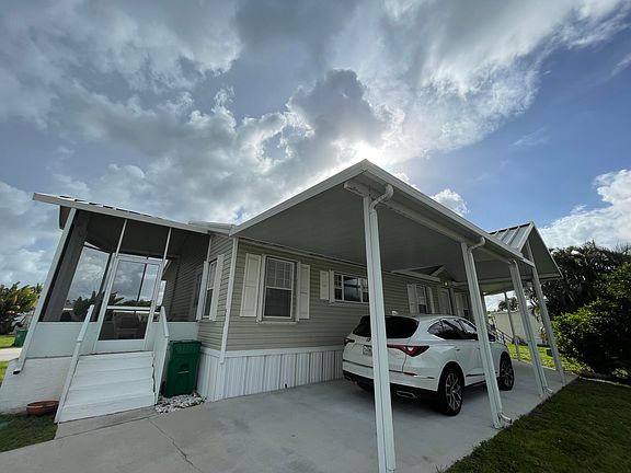 Lovely 3/2 Manufactured home in popular 55 plus community in Davie, Florida. Two-car carport with an elevated roof adds a spacious feel. Large eat-in kitchen with lots of light. There is abundance of white kitchen cabinets for your storage as well as a pantry closet. Have your morning coffee out on the breezy front screened-in porch which is accessed from the kitchen. Accordion hurricane shutters. Attached shed in rear. Use of community pools and shuffleboard included.
