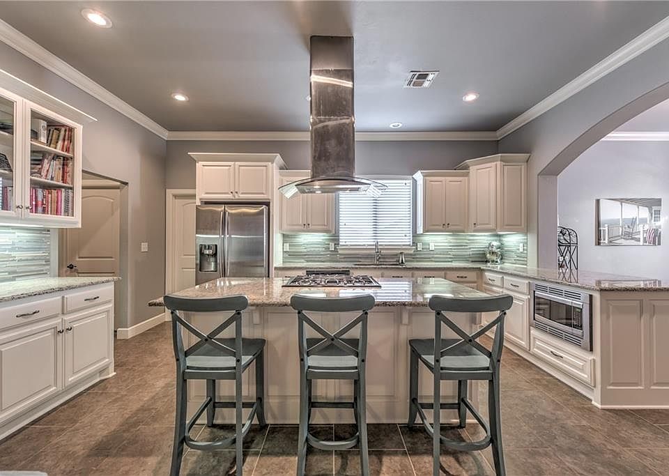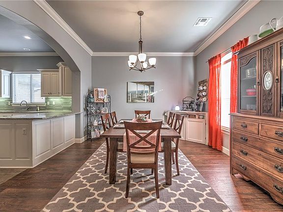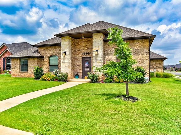 This home's beauty doesn't end at the gorgeous curb appeal and large covered porch, perched upon a lush corner lot... Step inside and take in the splendor of the main living area with main dining off the entry. Beautiful living room with gas corner fireplace and tall ceilings. You will love the open flow of the floor plan boasting a spacious kitchen with a huge center island, stainless steel appliances with sleek vent hood and an abundance of custom cabinetry including a walk-in pantry. Imagine getting up in the morning to this glorious spa-like master bath with double vanity, walk-in shower and massive closets. The utility room is large with abundant storage. Wood flooring in the dining area. Storm shelter in the garage. Outdoor entertainment made easy with the covered patio and fantastic yard! The craftsmanship and attention to detail are endless. Welcome Home!